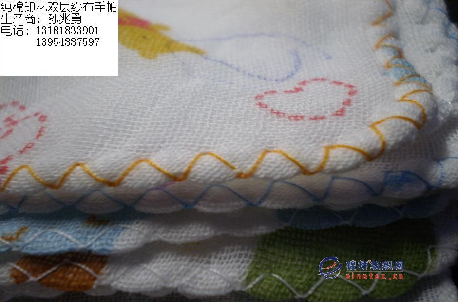 純棉印花雙層紗布以其獨(dú)有的吸濕,保暖,透氣和對(duì)皮膚無刺激等特點(diǎn),廣泛應(yīng)用于嬰孕貼身服裝,肚兜,尿片等生活衣著用品,精心呵護(hù)嬌嫩肌膚,尤其在夏秋季節(jié),即具備棉織物的良好保暖性有不失方眼紗布的特有透氣效果,使身體不至于著涼和起濕疹\痱子等,目前處于其他面料無法替代的狀況.聯(lián)系人:孫兆勇,電話:13181833901. |