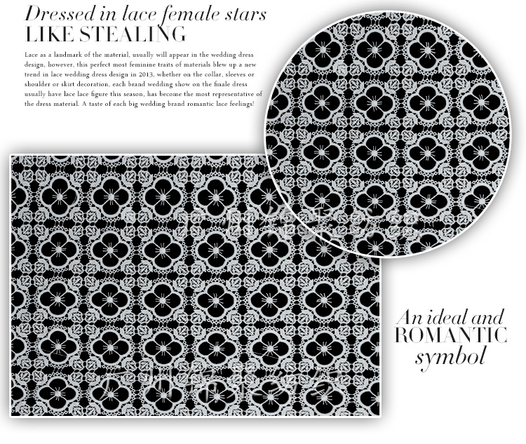 產(chǎn)品描述 http://jinjutextile.1688.com http://jjtextile.en.alibaba.com Basic Information基本信息 面料材質(zhì): 滌綸蕾絲 面料型號: JJ532-240 推薦款式: 連衣裙、短裙、襯衫、禮服等 面料幅寬: 122cm(可定制) 面料花型: 牛奶絲四葉草 面料售價: 39元 面料用途: 服裝面料/服裝輔料 面料顏色: 白色 起拍數(shù)量: 30碼 面料指標: 彈力:適中 (選項:無彈/適中/彈力/超彈力 ) 透視:半透明 (選項:超透/薇透/適中/不透) 厚度:適中 (選項:薄/適中/稍厚/超厚 ) 面料洗滌: 建議干洗 面料說明: 蕾絲有著高貴的血統(tǒng),是高級定制中精湛的手藝,如今運用在高級成衣里,從最初的手工編織的網(wǎng)眼花邊,到服裝上的點綴裝飾,再到透視裝的面料,或華麗純真、或性感妖嬈,總之蕾絲已不再是簡單的服裝裝飾,具有了自己的性格魅力,成為了調(diào)劑女人香的甜蜜芳香劑。