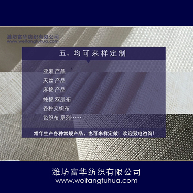 | 產(chǎn)品描述 | 除常規(guī)品種外,天絲、亞麻、棉麻、純棉多層布、各種交織布、色織布均可來樣定制!歡迎來電咨詢! |