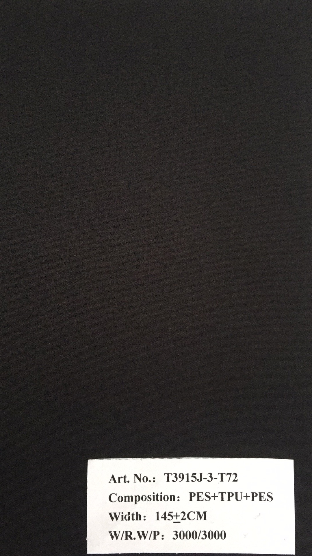 | 產(chǎn)品描述 | 編號:T3915J-3-T72 成份:PES+TPU+PES 幅寬:145±2CM 工藝:透氣透濕3000/3000 |