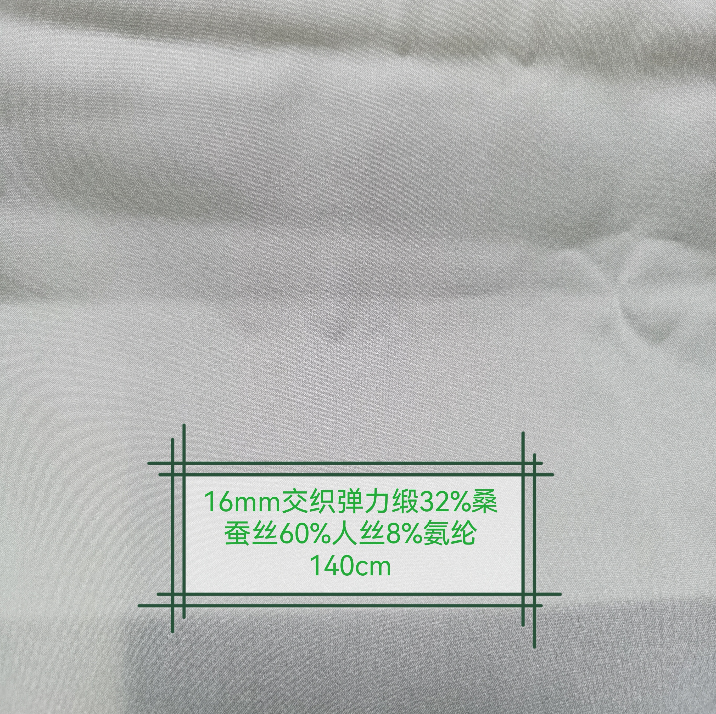 備注 16mm絲粘彈力緞32%桑蠶絲60%人絲8%氨綸。