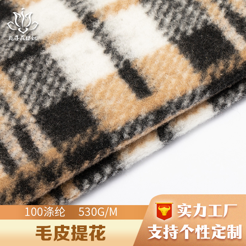 產(chǎn)品描述 這款提花布是采用滌綸材質(zhì)生產(chǎn)的人造毛皮面料,具有類似羊毛的手感和高阻燃性。每米530克的高克重使這款面料擁有較高的保暖性,而且滌綸也比天然纖維更加耐用、更容易保養(yǎng)。 這款面料通過提花工藝實現(xiàn)了類似虎紋的外觀效果,同時加入黑白駝三色格紋,可以讓成衣展現(xiàn)出更加個性、奢華的效果,適用于多種秋冬時尚服飾設計。 這款提花布由呢絨面料廠直供,小批量定制單可以在7-15天內(nèi)完成交付,大貨訂單的交付時間也在25-30天內(nèi),讓客戶有足夠的時間規(guī)劃生產(chǎn)。現(xiàn)在私信還可以免費拿樣。