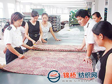 聊城檢驗檢疫局對轄區(qū)內全國最大的真蠟印花布生產企業(yè)臨清三和紡織集團有限公司進行了重點指導和幫扶,確保“質量和安全年”活動扎實有效開展,該局積極創(chuàng)新檢驗監(jiān)管放行模式,指導企業(yè)加強實驗室建設、加大歐美等市場開發(fā)力度,使該企業(yè)在全國蠟印布出口整體下滑的情況下,實現了一枝獨秀,有效降低了國際金融危機的影響。1~7月,該企業(yè)出口真蠟印花布1103批,貨值1.33億美元,同比貨值增長10.1%。圖為聊城局工作人員在企業(yè)進行現場監(jiān)管。