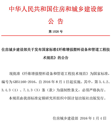 由中國(guó)石油和化工勘察設(shè)計(jì)協(xié)會(huì)和上海富晨化工有限公司主編的《纖維增強(qiáng)塑料設(shè)備和管道工程技術(shù)規(guī)范》GB51160-2016已獲國(guó)家住房和城鄉(xiāng)建設(shè)部批準(zhǔn)發(fā)布,自2016年8月1日起實(shí)施。