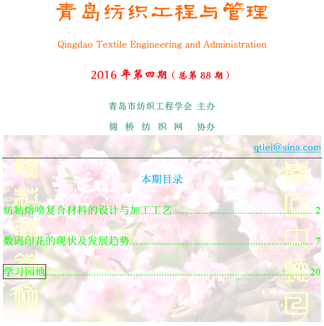 由青島市紡織工程學(xué)會(huì)主辦、錦橋紡織網(wǎng)協(xié)辦的《青島紡織工程與管理》電子期刊于2009年1月正式創(chuàng)刊。該刊由青島市紡織工程學(xué)會(huì)秦志強(qiáng)工程師任主編。該刊除以電子郵件形式發(fā)送至?xí)T單位外,還在錦橋紡織網(wǎng)開(kāi)設(shè)專(zhuān)門(mén)窗口供業(yè)內(nèi)人士進(jìn)行瀏覽與查閱。該刊的創(chuàng)辦定能為廣大紡織業(yè)技術(shù)人員提供1個(gè)技術(shù)交流平臺(tái),為我國(guó)紡織業(yè)技術(shù)創(chuàng)新起到積極作用。
