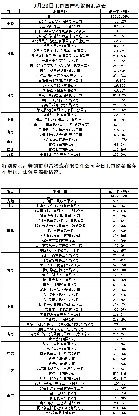 9月23日兩節(jié)共計(jì)輪出儲(chǔ)備棉30016.348噸。第一節(jié)銷(xiāo)售儲(chǔ)備棉15043.0540噸,其中國(guó)產(chǎn)棉15043.0540噸、進(jìn)口棉0噸。第二節(jié)銷(xiāo)售儲(chǔ)備棉14973.2940噸,其中國(guó)產(chǎn)棉14973.2940噸、進(jìn)口棉0噸。