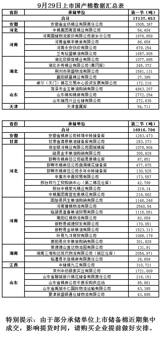 9月29日兩節(jié)共計(jì)輪出儲(chǔ)備棉34054.157噸。第一節(jié)銷售儲(chǔ)備棉17137.453噸,其中國(guó)產(chǎn)棉17137.453噸、進(jìn)口棉0噸。第二節(jié)銷售儲(chǔ)備棉16916.704噸,其中國(guó)產(chǎn)棉16916.704噸、進(jìn)口棉0噸。