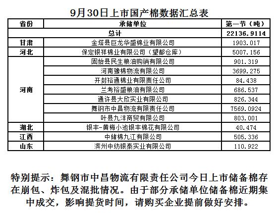 9月30日儲備棉第一節(jié)輪出22136.9114噸。儲備棉第二節(jié)銷售數(shù)據(jù)將于9月30日當日發(fā)布。