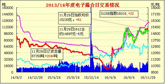 11月29日,電子撮合交易成交量增加,合約均價多數(shù)收漲,活躍交投主要集于中遠合同。據(jù)鹽城市經(jīng)作站棉花生產(chǎn)技術(shù)專家分析,今年鹽城實際植棉面積不足十萬畝,退至歷史最低谷,而且種植品種也很不單純,比較“多亂雜”。今年鹽城棉花產(chǎn)量效益再度呈現(xiàn)減產(chǎn)減收狀況,這對農(nóng)戶重拾植棉信心形成阻力。業(yè)內(nèi)認為,棉花年年種,棉價年年調(diào),但今年的籽棉收購報價是近三年來上漲幅度最大的。農(nóng)民在面臨大部分農(nóng)產(chǎn)品價格下行的壓力下,容易重溫種棉舊情,但國家棉花產(chǎn)業(yè)政策西移戰(zhàn)略的實施,還是令眾多棉農(nóng)的植棉情緒無法提振。所以,現(xiàn)在雖在棉種訂購季節(jié),農(nóng)戶對于明年的植棉無定數(shù)己在預(yù)訂種子這個環(huán)節(jié)充分表現(xiàn)出來。