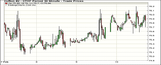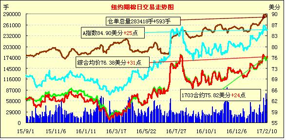 10日紐約期棉市場近漲遠(yuǎn)跌,波動(dòng)幅度一般,近期3月合約結(jié)算價(jià)75.82美分/磅,漲24點(diǎn);1705月合約77.09美分,漲44點(diǎn);1712月合約74.10美分,跌6點(diǎn)。成交維持高位,移倉交易活躍。當(dāng)日近期3月合約早盤穩(wěn)定,盤中多在75.8-76美分間波動(dòng),雖然短暫觸及76美分以上,但因缺乏買盤跟進(jìn)而挑戰(zhàn)失敗,最終以小幅上漲收盤。分析指出,市場目前有大量未點(diǎn)價(jià)合約,支持期棉市場穩(wěn)定。有消息稱,印度方面取消一些棉花出口合約或推遲裝運(yùn),有利于美國和非洲等地棉花出口。