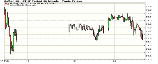 周三紐約期棉除3月合約外,其他合約均小幅下跌;1703合約收于74.14美分/磅,漲62點;1705合約收于75.49美分/磅,跌17點。當日紐約期棉交投清淡,主力合約開盤后保持小幅上漲趨勢,最高價在76美分/磅以上,之后合約回落并收跌。目前美國一些私人機構預測同樣看增2017/18年度美棉種植面積,預測下年度美國陸地棉和皮馬棉種植總面積在1140萬英畝。印度CAI預測2016/17年度印度產(chǎn)量在3410萬包(170公斤/包)。