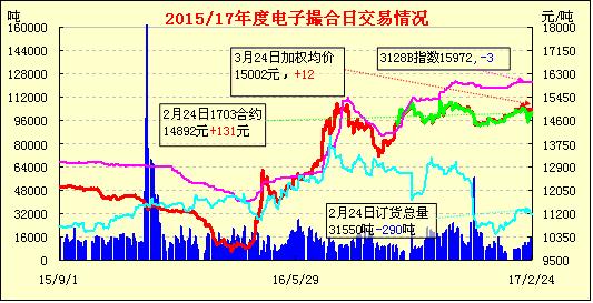 2月24日,電子撮合交易成交量下降,合同均價(jià)全部收漲,活躍交投主要集中于中遠(yuǎn)期合同。國儲(chǔ)棉將于3月6日輪出,受此影響,近期內(nèi)地市場出現(xiàn)波動(dòng),并且部分棉花報(bào)價(jià)略顯混亂。24日,河北東光某400型軋花廠3128級、3127級皮棉報(bào)價(jià)分別為16000元/噸、15600元/噸(提貨價(jià)、毛重結(jié)算),報(bào)價(jià)較昨日持平。