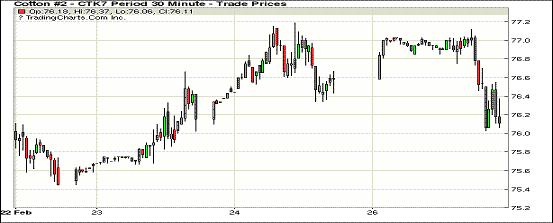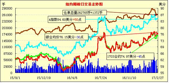 周一紐約期棉近跌遠漲;1703合約收于74.97美分/磅,跌45點;1705合約收于76.12美分/磅,跌45點。當日近月合約一改昨日走勢,交投跌幅在8至45點不等。1705開盤一度飆升至77.14美分/磅,后遇賣盤壓力以76.12美分/磅收跌。今日總成交量預期較前一日略有減少。3月6日中國將迎來拋儲,各方翹首以待。最新美棉出口周報有效提振期價,美棉出口簽約量已達2016/17年度USDA出口目標的89%,2017/18年度簽約量也已完成年度目標近8%。