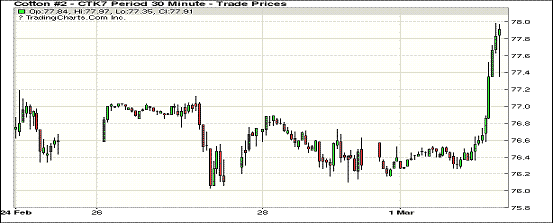 因商品市場(chǎng)上漲,周三紐約期棉主力和近月合約跳漲;1703合約收于76.85美分/磅,漲152點(diǎn);1705合約收于77.86美分/磅,漲152點(diǎn)。當(dāng)日主力合約開(kāi)市后走勢(shì)起伏較小,之后在大量買(mǎi)盤(pán)下上漲,收盤(pán)前合約從高位回落,但依然處于漲幅區(qū)間并保持,最終漲幅超過(guò)2%。周四美國(guó)農(nóng)業(yè)部即將發(fā)布最新出口周報(bào),美棉可能延續(xù)良好的銷(xiāo)售情況;至2月24日,美棉檢驗(yàn)達(dá)到373萬(wàn)噸,其中達(dá)到SLM1-1/16的達(dá)到69.9%,檢驗(yàn)總量和達(dá)到ICE期棉交割要求的棉花大幅高于去年同期。