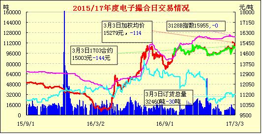 3月3日,電子撮合交易成交量下降,合同均價多數(shù)收跌,活躍交投主要集中于中遠(yuǎn)期合同。隨著國儲棉輪出的日期越來越近,棉花市場顯得較為平靜,似乎在等待著一次爆發(fā)。鄭棉期貨走勢顯得格外 “謹(jǐn)慎”,維持15000-16000/噸區(qū)間上下震蕩;現(xiàn)貨掛牌也尤為穩(wěn)定,基本在15000元/噸徘徊。期貨與現(xiàn)貨掛牌價差由2月7日的1033元/噸,再次回歸至700元/噸左右。預(yù)期國儲棉輪出之后,價差或會再次擴(kuò)大,貿(mào)易商可關(guān)注價差套利機(jī)會。下周儲備棉即將輪出,業(yè)界都十分關(guān)注。由于部分紡企庫存已空,為了維持運(yùn)轉(zhuǎn),近日也在剛需的壓力下采購新棉。某紡企近日在川內(nèi)購進(jìn)的疆棉新花到廠價達(dá)16600元/噸(毛重)。據(jù)另一紡企介紹,近日在新疆運(yùn)回一批棉花,成本價格約達(dá)16400-16500元/噸。
