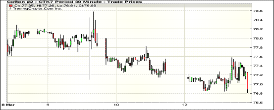 周一紐約期棉受外圍商品市場(chǎng)影響,下行壓力明顯。1705合約收于76.87美分/磅,跌42點(diǎn);1707合約收于77.86美分/磅,跌51點(diǎn)。當(dāng)日1705合約連續(xù)3個(gè)交易日下跌,13日開盤后受買盤影響價(jià)格一度小幅攀升,后遇賣盤壓力,收盤前30分鐘下跌,終收于76.87美分/磅。1712合約保持低位走勢(shì),收盤定位在74.98美分/磅。亞洲市場(chǎng)多地繼續(xù)采購(gòu)美棉,巴基斯坦簽約部分美國(guó)新花,孟加拉和越南入手部分近期裝運(yùn)美國(guó)陳棉。至3月10日,2016/17年度美國(guó)新花累計(jì)分級(jí)檢驗(yàn)376.47萬(wàn)噸,較15/16年度同期同比增加33個(gè)百分點(diǎn)。