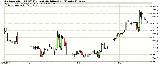 周三紐約期棉強(qiáng)勢(shì)反彈,近月合約漲幅在32至93點(diǎn)不等。1705合約收于78.08美分/磅,漲93點(diǎn);1707合約收于79.09美分/磅,漲90點(diǎn)。當(dāng)日1705合約開(kāi)盤后一路看漲,飆升至78.26美分高點(diǎn),收盤前回吐部分漲幅至78.08美分/磅。遠(yuǎn)月合約漲幅不敵近月,1712窄幅震蕩,收漲32點(diǎn)。目前紐約期棉還處在整理走勢(shì)階段,大多紡企選擇觀望行情。周三期價(jià)反彈,消息面多利好。一是15日美聯(lián)儲(chǔ)再次宣布加息,上調(diào)聯(lián)邦基準(zhǔn)利率25個(gè)基點(diǎn)至0.75%-1%,并確認(rèn)17年將加息3次。消息使得美元指數(shù)下跌,期貨價(jià)格大幅上漲。二是在美棉出口周報(bào)發(fā)布前一日節(jié)點(diǎn),良好的美棉出口情況有效提振期貨市場(chǎng)。三是中國(guó)2月棉花進(jìn)口量同比大增146%,對(duì)價(jià)格回漲確有刺激。