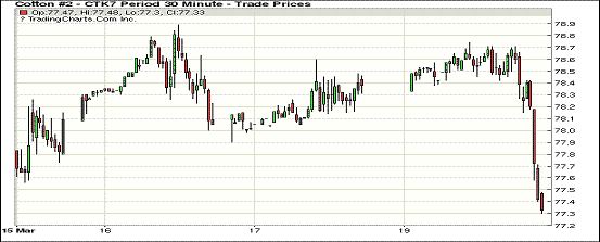 周一紐約期棉尾盤下挫,遠(yuǎn)漲近跌,其中1705合約暴跌。1705合約收于77.33美分/磅,跌103點(diǎn);1707合約收于78.54美分/磅,跌84點(diǎn)。當(dāng)日1705合約開盤后一度漲至78.75美分/磅,后遇賣盤壓力收跌于77.33美分/磅;1712合約終日保持窄幅波動(dòng),收盤僅斬獲4點(diǎn)增幅。收盤前美元指數(shù)回升使得大宗商品再次承壓,連累陳棉合約普遍下跌。澳棉主產(chǎn)區(qū)(新花吐絮階段)遇暴洪侵襲。此外,美國德州格蘭德河谷地及德州南部棉區(qū)也因降雨暫停播種。目前,格蘭德谷地已有70%左右的棉苗播種完畢。