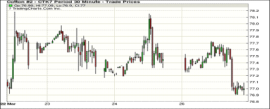 周一紐約期棉承壓下跌。1705合約收于76.94美分/磅,跌53點;1707合約收于78.31美分/磅,跌43點。當日開盤后,1705合約受抬價買盤影響經(jīng)歷漲跌起伏,后遇賣盤壓力一路走低,終收于76.94美分/磅。1712合約同1705走勢大致相同,收跌于75.02美分/磅。本周五,USDA將發(fā)布下年度美棉種植意向報告。德州南部和格蘭德河谷地喜迎春雨,棉苗已發(fā)芽。16/17年度美棉加工進度方面,德州西部平原僅有不到15家軋花廠開機,堪薩斯州已完成加工,奧克拉荷馬則僅余3家。