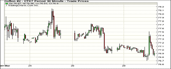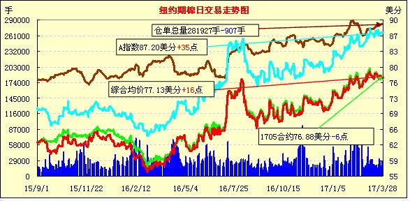 周二紐約期棉微幅收跌,近月合約跌幅在3到13點不等。1705合約收于76.88美分/磅,跌6點;1707合約收于78.28美分/磅,跌3點。當(dāng)日1705開盤后保持窄幅震蕩,后遇買盤支撐一躍至當(dāng)日最高77.51美分/磅,但拋盤壓力隨之而來,使最活躍合約收跌于76.88美分/磅。本周五12點(美國東部時間),USDA將發(fā)布下年度種植意向報告,部分紡企目前選擇按兵不動。外圍方面,美國股指受其國內(nèi)價格及消費者信心等因素提振,美指也在走強。另據(jù)USDA,德州大部分地區(qū)較為溫暖,大風(fēng)不止,強風(fēng)損壞了佩科斯河流域附近的部分棉田。