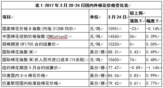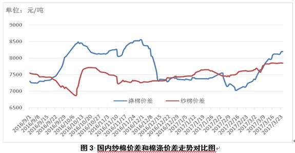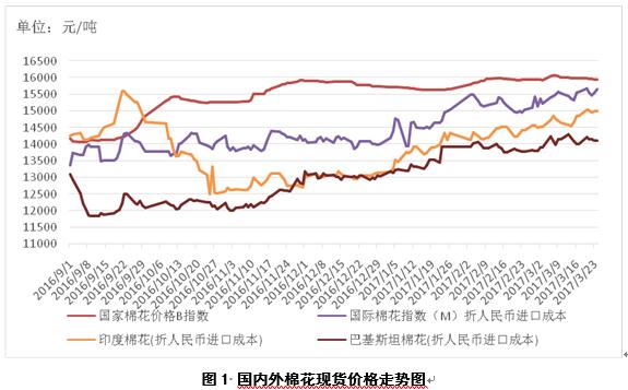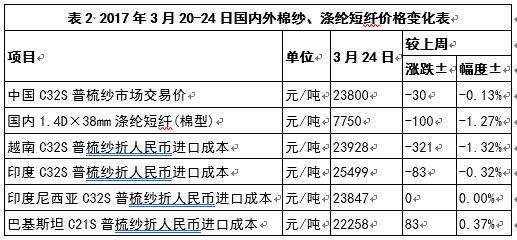 1、內(nèi)外棉花價(jià)差繼續(xù)縮小。3月24日,國際棉花指數(shù)(M)按折人民幣進(jìn)口成本15650元/噸(1%關(guān)稅,海關(guān)計(jì)征匯率,下同),低于國內(nèi)標(biāo)準(zhǔn)301元/噸,價(jià)差較上周縮小98元/噸;印度國內(nèi)S-6棉花折人民幣進(jìn)口成本15002元/噸,低于國內(nèi)949元/噸,價(jià)差較上周縮小163元/噸;巴基斯坦國內(nèi)標(biāo)準(zhǔn)級棉花折人民幣進(jìn)口成本14115元/噸,低于國內(nèi)1836元/噸,價(jià)差較上周縮小129元/噸(圖1)。