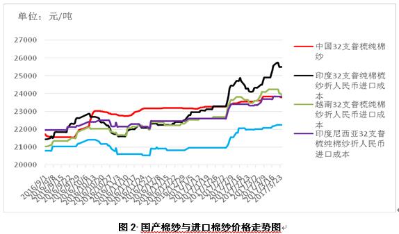 2、內(nèi)外棉紗價(jià)差縮小。3月24日,越南32支普梳純棉紗23928元/噸(折人民幣進(jìn)口成本,下同),較中國國內(nèi)32支普梳純棉紗高128元/噸,價(jià)差較上周縮小219/噸;印度32支普梳純棉紗25499元/噸,較中國國內(nèi)32支普梳純棉紗高1699元/噸,價(jià)差較上周縮小53元/噸;印度尼西亞32支普梳純棉紗23847元/噸,較中國國內(nèi)32支普梳純棉紗高47元/噸,價(jià)差較上周擴(kuò)大30元/噸(圖2)。