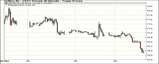 周三紐約期棉繼續(xù)承壓下行并跌破支撐線,近月合約跌幅在65至81點(diǎn)不等。1705合約收于76.14美分/磅,跌74點(diǎn);1707合約收于77.63美分/磅,跌65點(diǎn)。當(dāng)日1705合約開盤后震蕩調(diào)整,后遇賣盤壓力一路下跌,收盤前落于98點(diǎn)波動區(qū)間底部,終收跌于76.14美分/磅。市場多認(rèn)為,本周五USDA種植意向中,美棉種植面積將超過此前展望論壇1150萬英畝的預(yù)期。美國德州連夜起雨,有利于恢復(fù)表層土壤水分平整此前大風(fēng)吹翻的土地。有分析預(yù)測,本周四美棉出口周報(bào)中陸地棉裝運(yùn)量可能大致在25-30萬包之間。