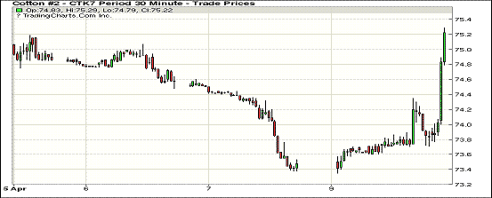 周一紐約期棉止跌反彈,近月合約漲幅在94至169點(diǎn)不等。1705合約收于75.15美分/磅,漲169點(diǎn);1707合約收于76.81美分/磅,漲134點(diǎn)。當(dāng)日近月合約一路走高,收盤前均在交投區(qū)間高位波動(dòng)。1705合約沖破前一日低谷,收于75.15美分/磅;1705成交量有所減少,資金繼續(xù)向7月展期。有貿(mào)易商及分析人士看增美棉出口預(yù)期數(shù)據(jù)并預(yù)測(cè)美棉期末庫(kù)存將相應(yīng)減少,但美國(guó)內(nèi)紡企消費(fèi)量是否能達(dá)到USDA此前330萬(wàn)包預(yù)期仍存疑問。
