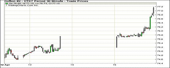 周一紐約期棉受7月合約帶動(dòng)強(qiáng)勁上揚(yáng),僅1710合約小幅下跌,1705合約收于77.03美分/磅,漲141點(diǎn);1707合約收于78.17美分/磅,漲163點(diǎn)。買(mǎi)盤(pán)支撐1707合約一路走高,一度飆至78.32美分高位,創(chuàng)四月以來(lái)新高,后在178點(diǎn)交投區(qū)間高位,收于78美分一線至上。1712合約斬獲82點(diǎn)漲幅收于74.24美分/磅,創(chuàng)自3月28日以來(lái)新高。資金展期,1705合約成交量繼續(xù)減少。期價(jià)上漲,市場(chǎng)認(rèn)為有多方因素:一是美棉現(xiàn)貨供應(yīng)將逐漸趨緊及On-call訂單數(shù)量變化,對(duì)近5月、7月支撐動(dòng)力較強(qiáng);二是近來(lái)美元指數(shù)疲軟促使商品價(jià)格提升。