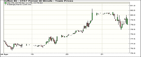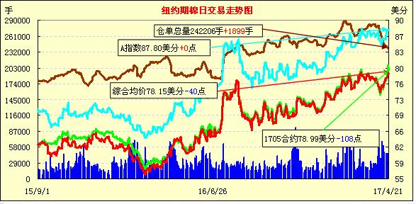 周五雖外圍美元指數(shù)上揚(yáng),谷物期貨下跌,但紐約期棉除5月合約受即將到期影響下跌,其他合約均保持穩(wěn)定,1707月合約79.33美分/磅,漲22點(diǎn)。當(dāng)日7月合約穩(wěn)定開盤,盤中受賣盤打壓跌破79美分,交易后期反彈以小漲收盤。分析師指出,5月合約將于4月24日進(jìn)入交割期,紡織廠要么點(diǎn)價(jià)要么將基準(zhǔn)合約后移,前一交易日沖破80美分與點(diǎn)價(jià)有關(guān),進(jìn)入交割期后,未點(diǎn)價(jià)合約基準(zhǔn)價(jià)多數(shù)將移到7月,對7月合約亦形成支持。美棉出口勢頭強(qiáng)勁,紐約期棉登記庫存量減少,支持紐約期棉穩(wěn)定。