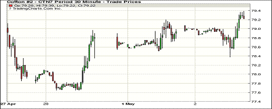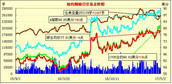 周二紐約期棉合約價(jià)格整體繼續(xù)上漲。1705合約收于80.83美分/磅,漲38點(diǎn);1707合約收于79.37美分/磅,漲42點(diǎn)。開盤后1707一路承壓,窄幅震蕩,后買家返場支撐其至79.43美分當(dāng)日最高點(diǎn),終收于交投區(qū)間高位,報(bào)79.37美分/磅。1712同樣受買盤支撐,報(bào)收于50點(diǎn)交投區(qū)間高位。據(jù)ICAC最新預(yù)測,17/18年度全球棉花種植面積將增加5%至3080萬公頃,全球總產(chǎn)量將增加4%至10830萬包,總消費(fèi)量增加2%至11280萬包,其中中國紡企消費(fèi)量將增加1%至3540萬包,約占全球總消費(fèi)量的31%,全球期末庫存下降超過5%至7540萬包。