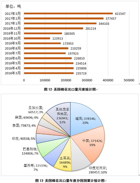 2017年3月,美國出口棉花42.1萬噸,較2月份增加4.4萬噸(圖12);2016年9月-2017年3月,美國累計出口棉花190.3萬噸,同比增加90.4萬噸,出口目的地主要為越南、中國、印度尼西亞、土耳其、墨西哥、巴基斯坦、印度、泰國、韓國和孟加拉國,占比分別為20%、19%、10%、9%、7%、7%、5%、4%、4%和3%(圖13)。