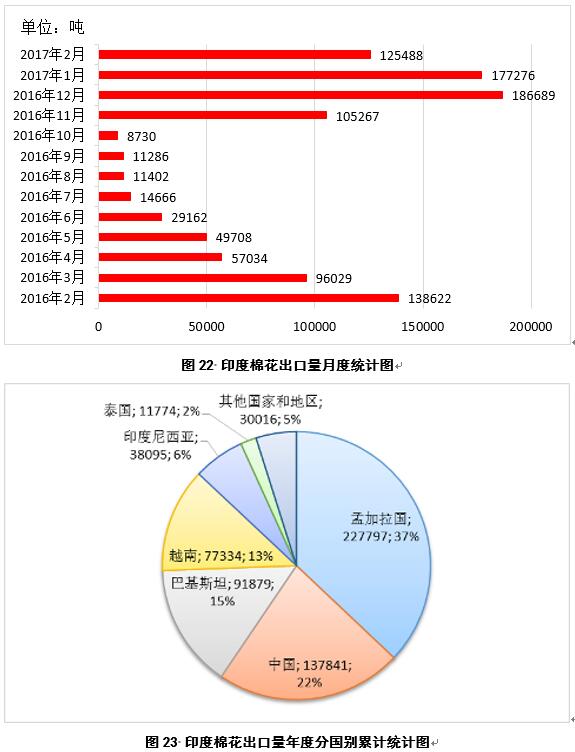 2017年2月,印度出口棉花12.5萬噸,較1月份減少5.2萬噸(圖22);2016年9月-2017年2月,印度累計出口棉花61.5萬噸,同比減少34.9萬噸,主要出口目的地為孟加拉國、中國、巴基斯坦、越南、印度尼西亞和泰國,占比分別為37%、22%、15%、13%、6%和2%(圖23)。