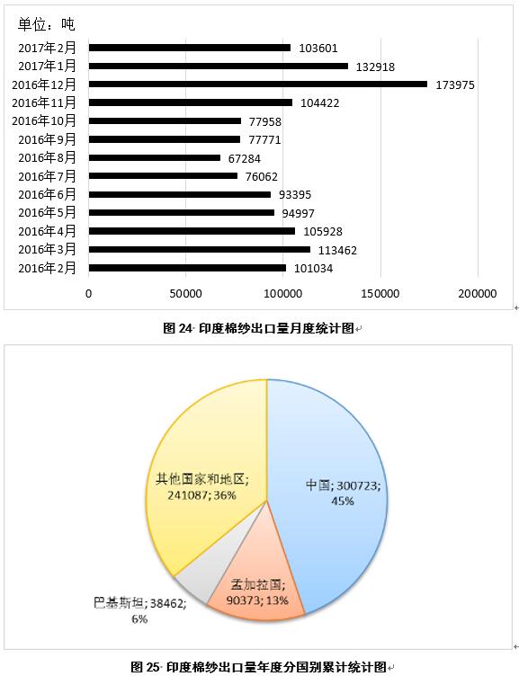 2017年2月,印度出口棉紗10.4萬噸,較1月份減少2.9萬噸(圖24);2016年9月-2017年2月,印度累計出口棉紗67.1萬噸,同比減少2.3萬噸,主要出口目的地為中國、孟加拉國和巴基斯坦,占比分別為45%、13%和6%(圖25)。