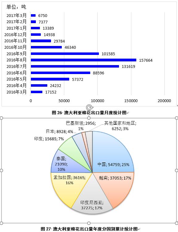 2017年3月,澳大利亞出口棉花0.67萬噸,較2月份減少0.06萬噸(圖26);2016年9月-2017年3月,澳大利亞累計出口棉花22.02萬噸,同比減少2.61萬噸,主要出口目的地為中國、越南、印度尼西亞、孟加拉國、泰國、印度、日本和巴基斯坦,占比分別為25%、17%、16%、10%、7%、4%和1%(圖27)。