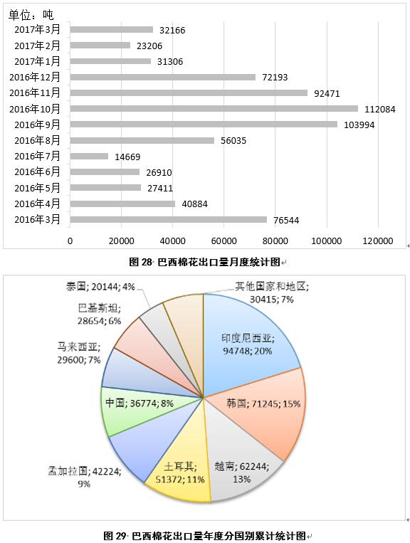 2017年3月,巴西出口棉花3.2萬噸,較2月份增加0.9萬噸(圖28);2016年9月-2017年3月,巴西累計出口棉花52.3萬噸,同比增加31.2萬噸,主要出口目的地為印度尼西亞、韓國、越南、土耳其、孟加拉國、中國、馬來西亞、巴基斯坦和泰國,占比分別為20%、15%、13%、11%、9%、8%、7%、6%和4%(圖29)。