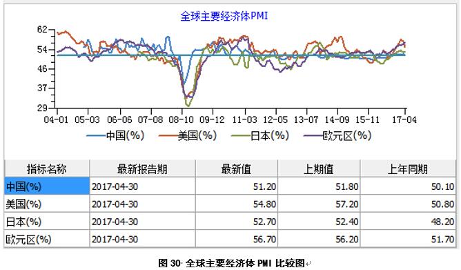 2017年4月,全球主要經(jīng)濟體PMI總體保持平穩(wěn),其中中國和歐元區(qū)環(huán)比略有下跌,美國和日本環(huán)比略有上漲(圖30)。