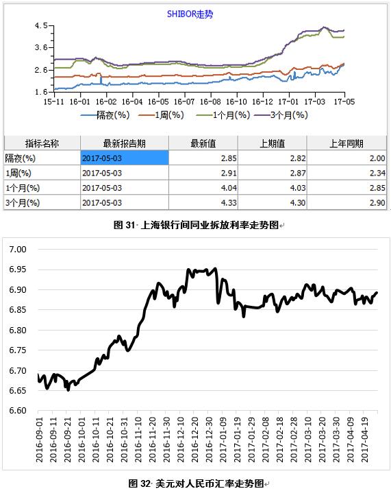 2017年5月3日,上海銀行間同業(yè)隔夜拆放利率2.85,環(huán)比上漲0.03,同比上漲0.85(圖31);美元對人民幣匯率中間價6.8931,環(huán)比下跌0.0062,跌幅0.09%,同比下跌0.1023,跌幅1.57%(圖32)。