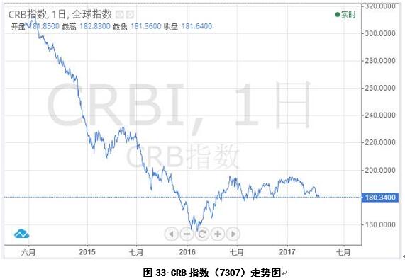 2017年4月28日,CRB指數(shù)(7307)收盤價181.73,環(huán)比下跌4.15,跌幅2.23%(圖33)。