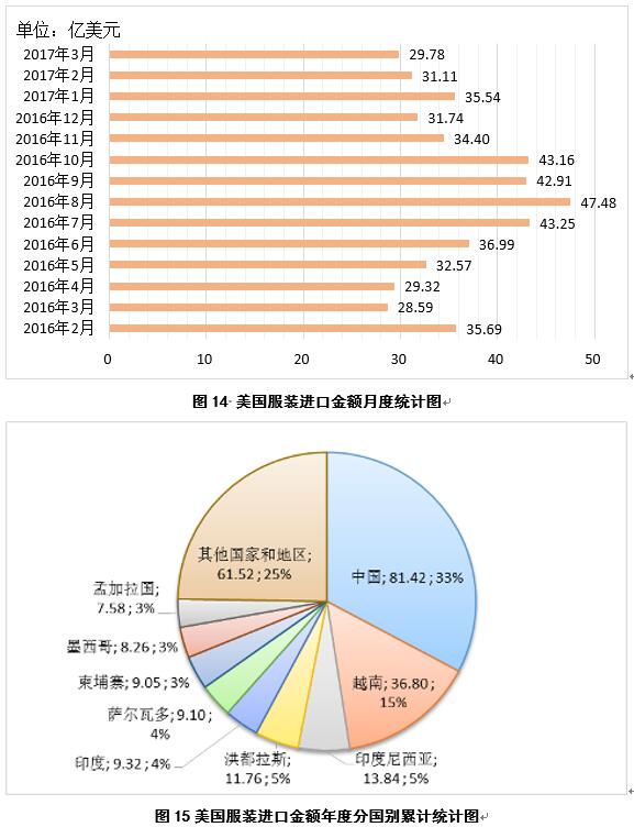 2017年3月,美國服裝進口金額29.78億美元,較2月份減少1.33億美元(圖14);2016年9月-3月,美國累計服裝進口金額248.65億美元,同比減少12.29億美元,主要進口來源為中國、越南、印度尼西亞、洪都拉斯、印度、薩爾瓦多、柬埔寨、墨西哥和孟加拉國,占比分別為33%、15%、5%、5%、4%、4%、3%、3%和3%(圖15)。