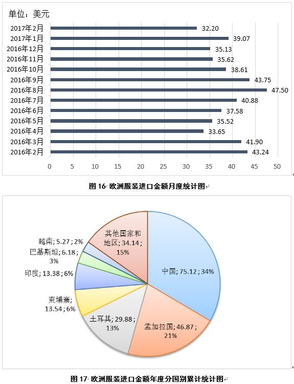 2017年2月,歐洲服裝進口金額32.2億美元,較2017年1月份減少6.87億美元(圖16);2016年9月-2017年2月,歐洲累計服裝進口金額224.39億美元,同比減少15.5億美元,主要進口來源為中國、孟加拉國、土耳其、柬埔寨、印度、巴基斯坦和越南,占比分別為34%、21%、13%、6%、6%、3%和2%(圖17)。