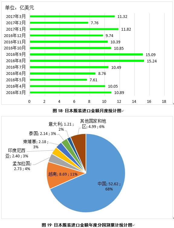 2017年3月,日本服裝進口金額11.32億美元,較2月份增加3.56億美元(圖18);2016年9月-2017年3月,日本累計服裝進口金額76.96億美元,同比減少5.17億美元,主要進口來源為中國、越南、孟加拉國、印度尼西亞、柬埔寨、泰國和意大利,占比分別為68%、11%、4%、3%、3%、3%和2%(圖19)。