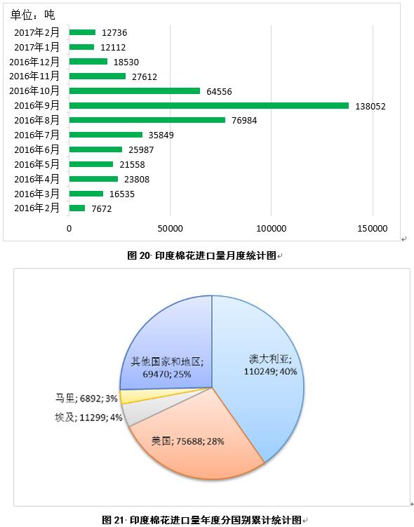 2017年2月,印度進口棉花1.2萬噸,較1月份略有增加(圖20);2016年9月-2017年2月,印度累計進口棉花27.4萬噸,同比增加19.4萬噸,主要進口來源為澳大利亞、美國、埃及和馬里,占比分別為40%、28%、4%和3%(圖21)。