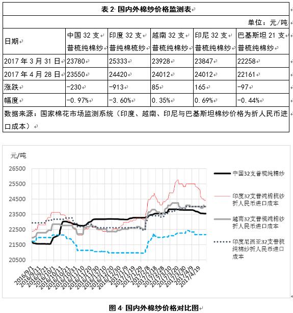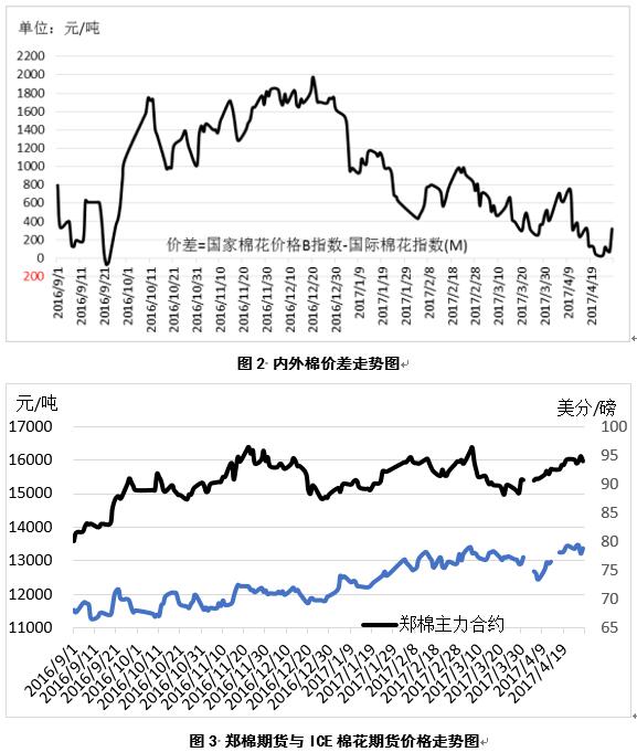 4月份以來,國內(nèi)棉花價格依然較為穩(wěn)定,外棉價格有所上漲,內(nèi)外棉價差進一步縮??;印度棉紗大幅下跌,價格已十分接近越南和印度尼西亞棉紗,但仍明顯高于中國國內(nèi)棉紗;國內(nèi)紡織企業(yè)產(chǎn)銷率仍保持較高水平,購棉意向有所增強,儲備棉出口成交相對穩(wěn)定;國內(nèi)外金融政策依然偏緊,國際大宗商品走勢總體偏弱,但棉花期貨價格相對堅挺。