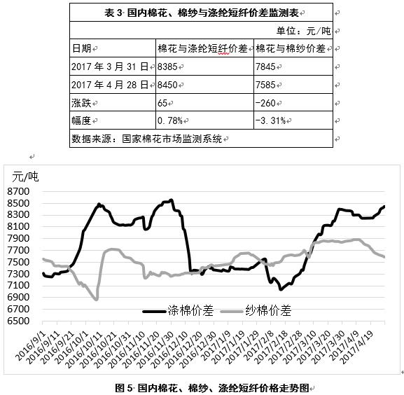 4月份以來,國內(nèi)棉花與滌綸短纖之間價差略有增加,環(huán)比增幅0.78%;與棉紗之間價差也有所減小,環(huán)比減幅3.31%(表3、圖5)。