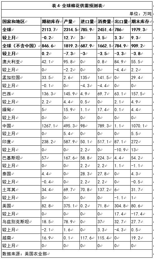 美國農(nóng)業(yè)部4月份發(fā)布的數(shù)據(jù)顯示,2016/17年度,全球棉花期初庫存較上月略有調(diào)減,產(chǎn)量、貿(mào)易量和期末庫存均較上月有所調(diào)增;中國以外地區(qū)棉花期初庫存略有調(diào)增,產(chǎn)量、消費量、貿(mào)易量和期末庫存均有所調(diào)減,棉花產(chǎn)大于需157萬噸,較上月增加3萬噸(表4)。