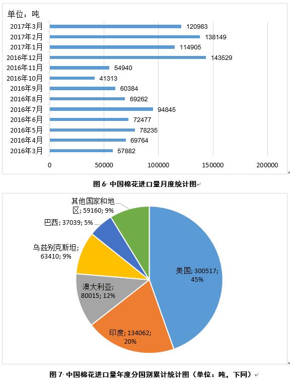 2017年3月,中國進口棉花12.1萬噸,較2月份減少1.7萬噸(圖6);2016年9月-2017年3月,中國累計進口棉花67.4萬噸,同比增加10萬噸,主要進口來源為美國、印度、澳大利亞、烏茲別克斯坦和巴西,占比分別為45%、20%、12%、9%和5%(圖7)。