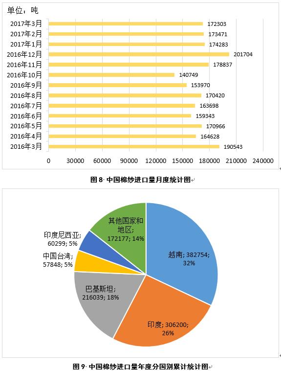 2017年3月,中國進口棉紗17.2萬噸,較2月份減少0.1萬噸(圖8);2016年9月-2017年3月,中國累計進口棉紗119.5萬噸,同比減少1萬噸,主要進口來源為越南、印度、巴基斯坦、中國臺灣和印度尼西亞,占比分別為32%、28%、18%、5%和5%(圖9)。
