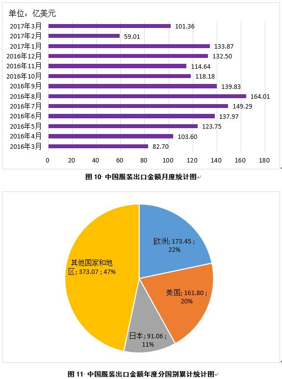 2017年3月,中國服裝出口金額101.36億美元,較2月份增加42.35億美元(圖10);2016年9月-2017年3月,中國累計服裝出口金額799.38億美元,同比減少88.57億美元,主要出口市場為歐洲(只包括歐盟及英國,下同)、美國和日本,占比分別為22%、20%和11%(圖11)。
