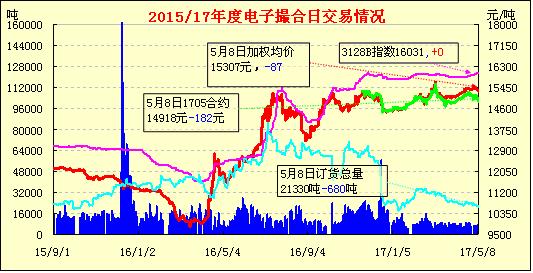 5月8日電子撮合交易成交量增加,合同均價(jià)全部收跌,活躍交投主要集中于中遠(yuǎn)期合同。目前,菏澤市場上高指標(biāo)(長度29以上,斷裂比28以上)新疆棉銷售價(jià)格在16100元/噸附近,競拍的新疆棉銷售價(jià)格更高;菏澤地區(qū)競拍的地產(chǎn)棉價(jià)格高指標(biāo)(雙29以上)銷售價(jià)在15400元/噸左右,2016年度地產(chǎn)棉指標(biāo)好41級銷售價(jià)格15650元/噸,22級棉花在15300元/噸左右。
